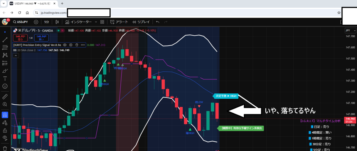 BB、一目均衡表(雲)、移動平均線すべてが上昇トレンド傾向の5分足。1分足でも一応トレンド確認。